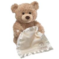 Little ones will giggle with delight as they play peek-a-boo with this adorable bear. Holding a cream-colored blanket, this beige soft plush bear will raise and lower his blanket to play a game of peek-a-boo when his foot is pressed. The bear's mouth moves as he says "Peek-a-boo, I see you," and other phrases to the child.