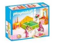 The princess has converted her bedroom in to a nursery so she can watch over her newborn baby at all times. Princess, baby, king size bed, cradle, vanity, side table, vase with flowers, throw rug, baby accessories.