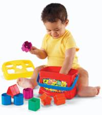 Ten colorful blocks for baby to sort, stack and drop. Filling the bucket with blocks, dumping them out, and starting over is great for eye-hand coordination and other early skills. Then baby can move on to stacking and matching, and sorting the five different block shapes through the shape-sorting lid. All 10 blocks fit inside the bucket, with a carry handle for easy take-along.