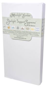 Designed with advanced health, safety and comfort standards, the Starlight Support mattress from Moonlight Slumber is a premium mattress for the most discerning of parents. The Starlight Support Supreme offers dual levels of firmness. There is an extra firm side for your infant. Then as your baby grows older (9+ months), you can flip the Supreme over and have an ultra supportive, yet ultra comfortable layer of viscoelastic foam over our firm mattress. Viscoelastic foam is the "memory" foam originally created by NASA. Viscoelastic foam conforms to your child's contours, supporting their growing joints, and keeping their spine in perfect alignment. Completely antimicrobial with welded seams, premium ticking, and cornered edges, each Starlight Support Supreme mattress comes standard with an internal Fire Barrier making it open flame resistant. The Starlight Support mattress line exceeds all current and planned Federal standards for fire safety and meets Cal. TB603. The Starlight Support Supreme mattress is simply the best mattress available.
